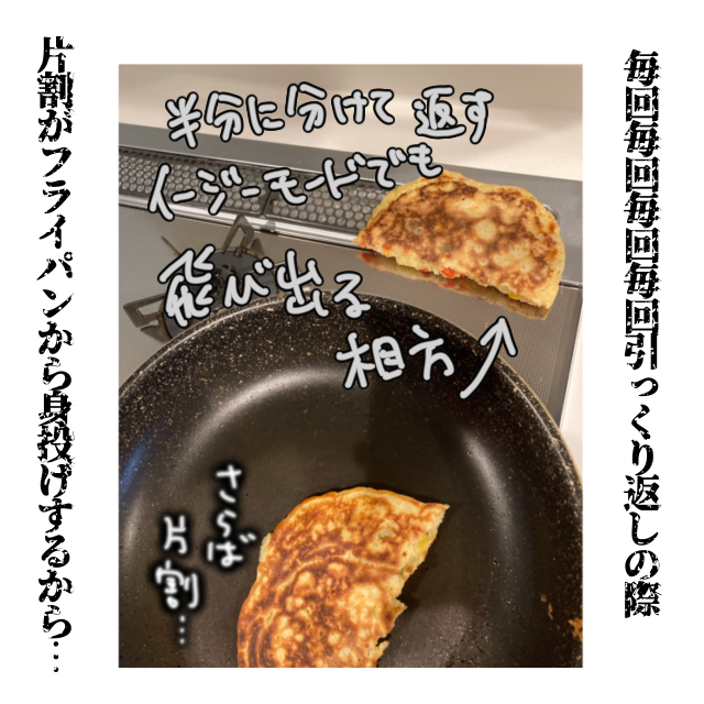 美味しくて手軽なお好み焼きのはずが・・・あれれ!?アツアゲさんの作るお好み焼きはちょっと活きがよすぎるようですね(笑)でも、飛び出した片割れも味は同じ!問題なしです!!