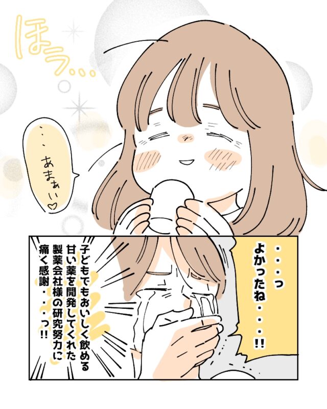 子どもの辛そうな姿を見るのは本当に胸が痛みますね。そんな中で見せてくれる笑顔に親がどれだけ救われるか・・・。子どもが飲みやすい甘いお薬、本当に助かりますね!