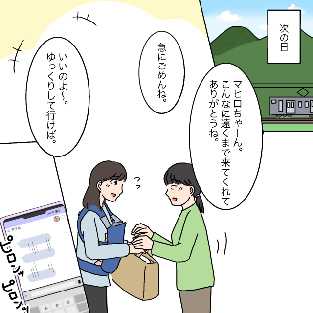 次の日、新幹線と在来線を乗り継いで実家に帰った私を「マヒロちゃーん。こんなに遠くまで来てくれてありがとうね。」と母は喜んでくれました。そして「いいのよ~。ゆっくりして行けば。」とだけ言ってくれました。そうしている間にも、ピロンピロンとなり止まない私のスマホ。
