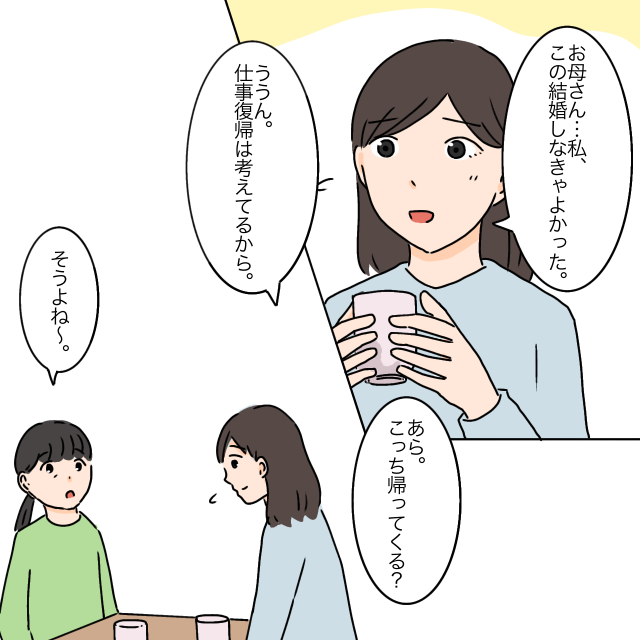 そして、「お母さん・・私、この結婚しなきゃよかった」と言うと、「あら。こっち帰ってくる?」とたずねられ、「ううん。仕事復帰は考えてるから」と自分の考えを伝えると、母も納得してくれました。
