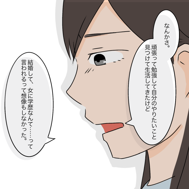 「なんかさ。頑張って勉強して自分のやりたいこと見つけて生活してきたけど、結婚して、女に学歴なんて・・って言われるって想像もしなかった」と話すと、