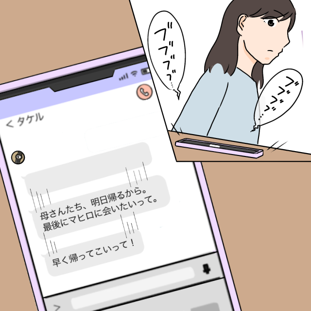 「母さんたち、明日帰るから。最後にマヒロに会いたいって」「早く帰ってこいって!」とタケルからメッセージが。