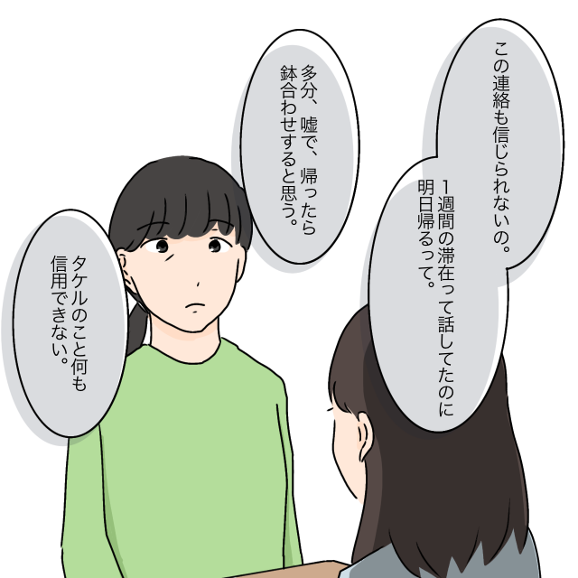 「この連絡も信じられないの。1週間の滞在って話してたのに明日帰るって。多分、嘘で、帰ったら鉢合わせすると思う。タケルのこと何も信用できない」タケルに返信せず、母に自分の思いを伝えると、