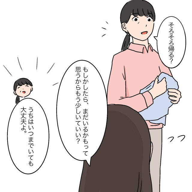 すると、「そろそろ帰る?」と察したのかそうたずねるお母さん。「もしかしたら、まだいるかもって思うから、もう少しいていい?」と言うと、「うちはいつまでいても大丈夫よ」と言ってくれました。