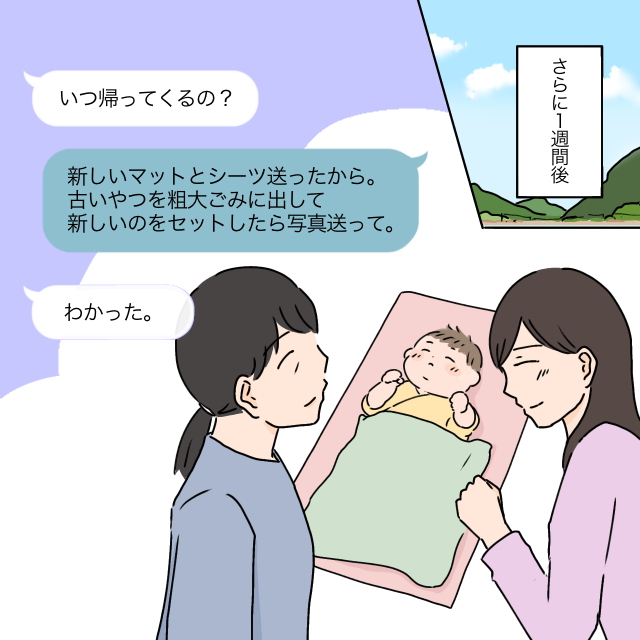 モエさんが実家に帰って1週間が経った頃、「母さん達帰ったよ」とタケルさんからメッセージが。でも、「まだいるかも」と考えたモエさんは帰らず実家に。タケルさんには新しいマットとシーツを送り、「古いものは粗大ごみ、新しいマットとシーツをセットしたら写真を送って」と伝えてから数日後、家に帰ったモエさんとマヒロちゃんを見て、驚くタケルさん。モエさんは早速「ちょっと話があるんだけど」と言いました。