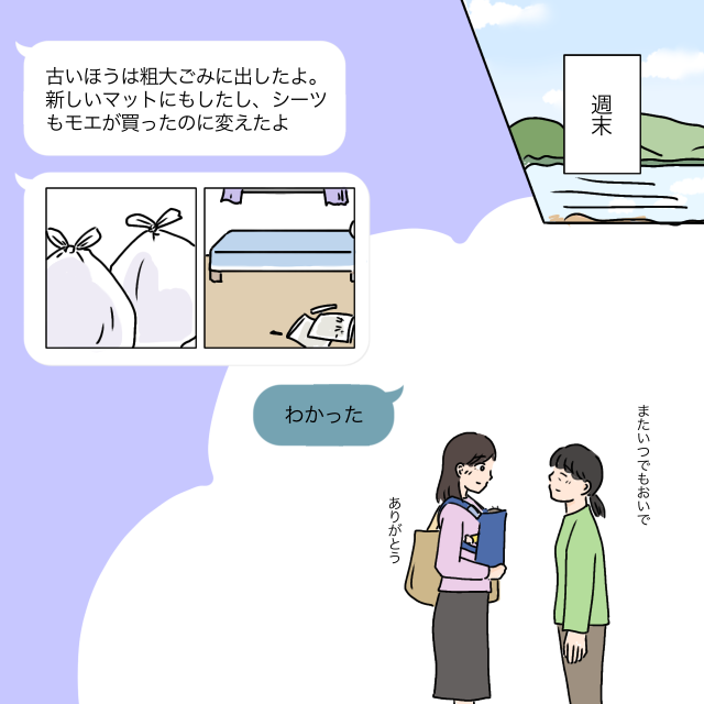 「古いほうは粗大ごみに出したよ。新しいマットにもしたし、シーツもモエが買ったのに変えたよ」メッセージと一緒に粗大ごみの写真と新しいマットの写真が送られてきました。その後、「わかった」と返事をして、お母さんとお別れ。「またいつでもおいで」と言ってくれるお母さんに「ありがとう」と感謝の気持ちでいっぱいでした。