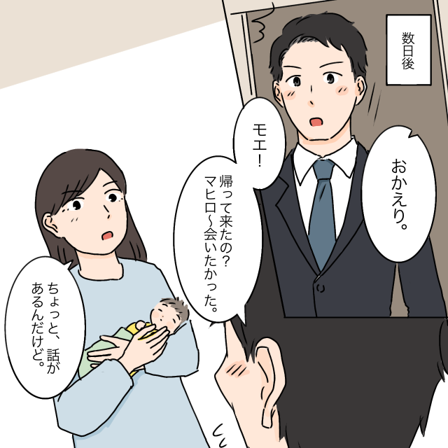 「おかえり」仕事から帰って来たタケルにそう言うと、「モエ!帰って来たの?マヒロ~会いたかった」と嬉しそうに言うのを見て、「ちょっと、話があるんだけど」と切り出しました。