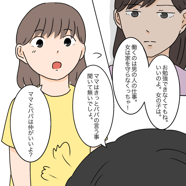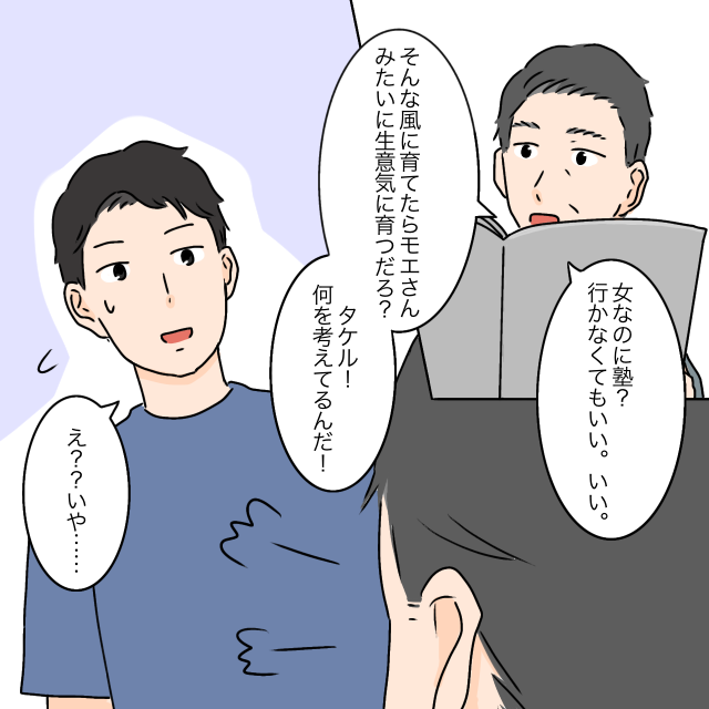 義父も「女なのに塾なんか行かなくていい、そんな風に育てたらモエさんみたいに生意気に育つだろ?」と、義母の考えに同調します。「マヒロをそんな風に育てようとしているなんて、何を考えてるんだ」と義父に叱られるタケルですが、「え?いや・・・」と困った表情をするだけで、私たちをかばう様子はありません。