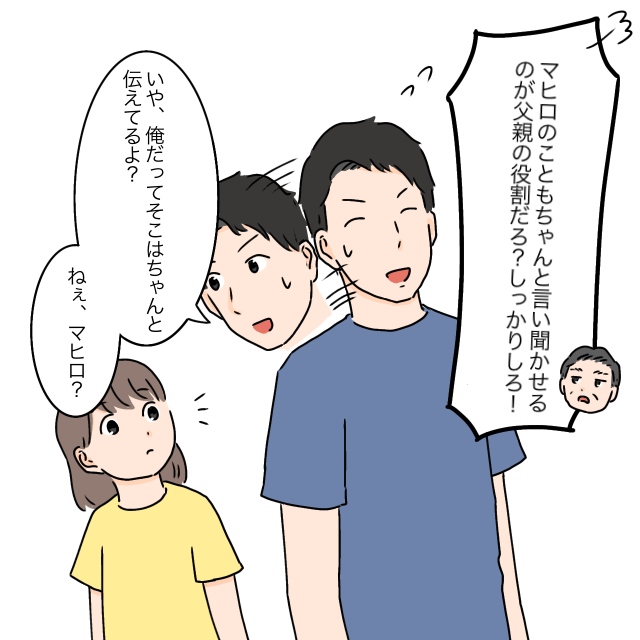 タケルが同意しなかったことに腹を立てたのか、「マヒロのこともちゃんと言い聞かせるのが父親の役割だろ」と大きな声で怒鳴る義父。返答に困ったタケルは、「俺だってそこはちゃんと伝えてるよ?ねぇマヒロ?」とマヒロに助け舟を求めます。