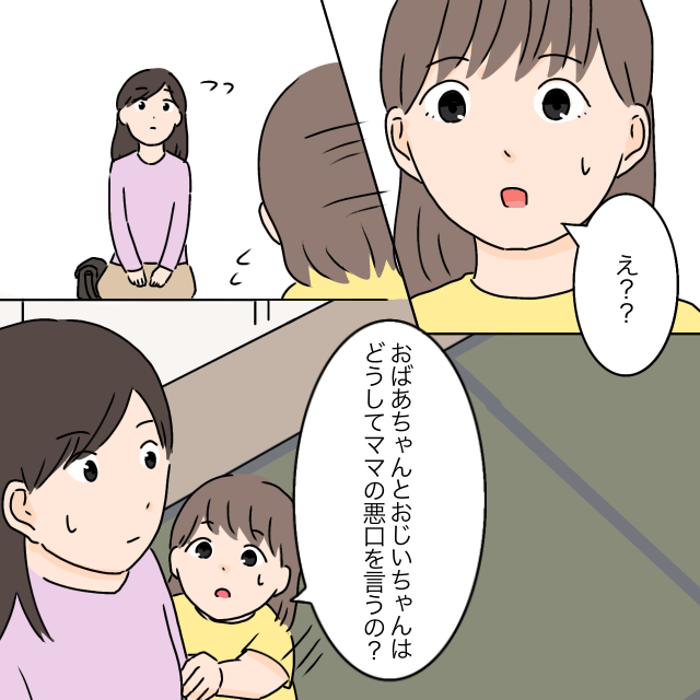 急にタケルに話を振られたマヒロは、困った様子で私に駆け寄ります。そして「おばあちゃんとおじいちゃんはどうしてママの悪口を言うの?」と聞いてきました。私にだけ意地悪な態度を取る2人を見て、不思議に思うのも無理はありません。