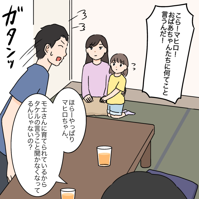 タケルは身を乗り出して「こら!おばあちゃんたちに何てこと言うんだ!」と怒鳴りました。マヒロは間違ったことは何も言っていないのに・・・。自分の娘よりも親の言う事を優先するタケルに、呆れた表情を向けます。するとその様子を見て、義母が「ほら、やっぱりモエさんに育てられているからタケルの言う事を聞かなくなっているんじゃないの?」と嫌味たらしく言いました。