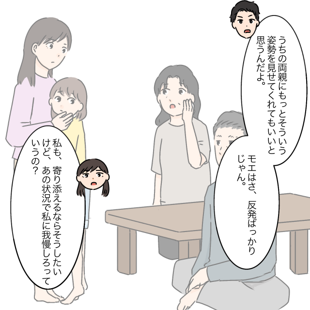 「女に学歴は必要ないと決めつけないでほしい」と自分の考えを伝えたモエさんでしたが、「聞き流せばいいじゃん、夫の顔を立てるとかできないの?」と、自分の立場しか主張しないタケルさん。「うちの両親にも寄り添ってほしい」と中々引き下がらないタケルさんに嫌気が差したモエさんは、「これ以上私とマヒロを巻き込まないでよ!」と声を荒げました。「マヒロが義実家に行きたいと言うなら連れて行ってもいいけど、行きたくないなら行かせるつもりはない」と、義両親との今後の付き合い方について話すも、タケルさんは「どうせ俺の実家には行かないようにってマヒロに吹き込むでしょ?」とモエさんを信用していない様子。どこまでもモエさんを悪者扱いする態度に怒りがこみ上げましたが、ぐっと堪え「吹き込むことはしない、あなたの両親がマヒロにどんな対応をするかで変わる」と伝えました。話し合いの結果、モエさんは今後一切義両親と会わなくてすむようになりましたが、タケルさんの希望で、マヒロちゃんは今後も義両親と付き合っていくことになりました。