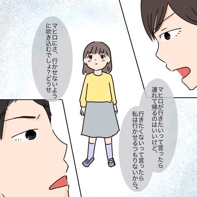 怒りが爆発しないようにぐっと堪え、「吹き込むことはしない、これからあなたの両親がマヒロにどんな対応をするかで変わるでしょ?」と冷静に伝えました。するとタケルは、「じゃあ絶対に邪魔するなよ」と指図するように言いました。