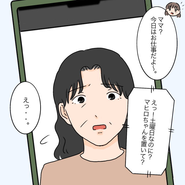「今日ママは?」という義母の問いかけに、「ママ?今日はお仕事だよ」と答えるマヒロ。すると義母は、ありえないと言った様子で「土曜日なのに?マヒロちゃんを置いて?」と言いました。予想外の反応に、マヒロから「えっ・・・」と驚く声が漏れます。