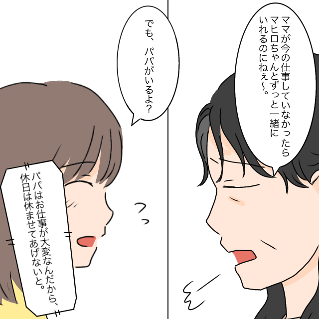 「ママが今の仕事をしていなかったら、マヒロちゃんとずっと一緒にいられるのにねぇ~」とため息をつきながら言う義母に、マヒロは「でも、パパがいるよ?」とフォローします。すると「パパはお仕事が大変なんだから休日は休ませてあげないと」と言う義母。マヒロは、ママだってお仕事を頑張っているのになんでパパばかり褒めるんだろう・・・?と不思議に思いながらも会話を続けます。