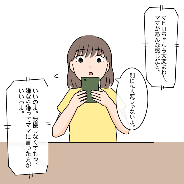 「マヒロちゃんも大変よね~ママがあんな感じだと」義母の悪口は止まりません。マヒロは戸惑いながらも、「別に大変じゃないよ」と義母の言葉を否定するも、「いいのよ我慢しなくても、嫌なら嫌ってママに言った方がいいわよ」と、マヒロの気持ちを決めつけるように話し続けます。