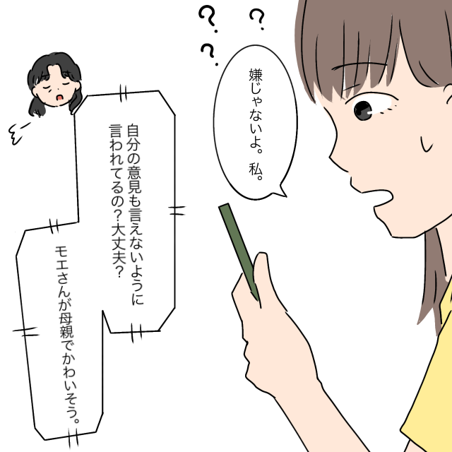 なんでおばあちゃんは、私がママを嫌がっているかのように話すんだろう・・・?マヒロは疑問に思いながら「嫌じゃないよ私」と本心を伝えます。しかし、義母は「自分の意見も言えないように言われてるの?モエさんが母親でかわいそう」と悪口を続けるばかりです。