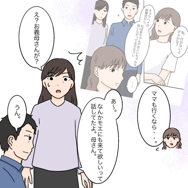 モエさんとマヒロちゃんが義実家と疎遠になって数年後、タケルさん側の親族の結婚式があると連絡をもらい、出席することに気が進まないマヒロちゃんは「ママが行くなら行く」と言いました。するとタケルさんが「母さんがモエにも来て欲しいって話してたよ」と言い「今回は家族で出席しよう」と懇願するので、義実家に泊まらないという条件で渋々出席を決めたモエさん。そして披露宴当日。数年ぶりに会った義母は相変わらず嫌味全開で、モエさんも顔を引きつらせながら笑顔で応戦しました。