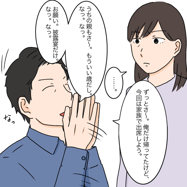 私に嫌味ばかり言っていたお義母さんが私に来て欲しいなんて・・本当かしら?と半信半疑で出席を迷っていると、タケルが「ずっとさ~俺だけ帰ってたけど、今回は家族で出席しよう。うちの親もさ~もういい歳だし。なっ、なっ!お願い。披露宴だけ。なっ、なっ!」と言いました。