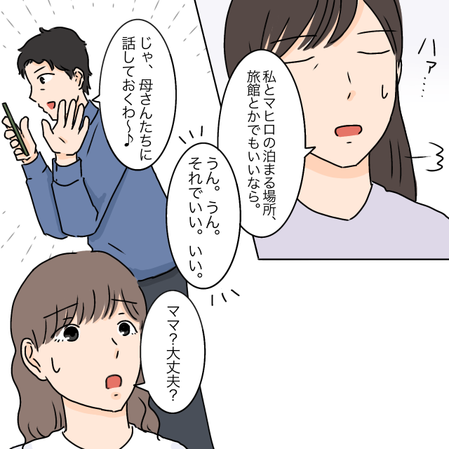タケルがあまりにもお願いするので「私とマヒロの泊まる場所、旅館とかでもいいなら」と条件を出すと、タケルは「うん、うん。それでいい」と言ってすぐに「じゃ、母さんたちに話しておくわ~」と意気揚々と義母に連絡していました。すると「ママ?大丈夫?」マヒロが心配そうに聞いてきました。