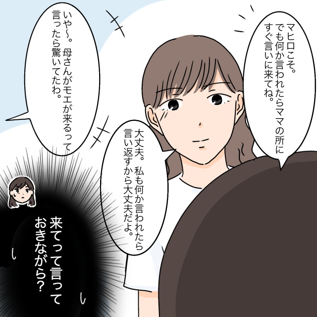「マヒロこそ。でも、何か言われたらママのところにすぐ言いに来てね」と言うと、「大丈夫。私も何か言われたら言い返すから大丈夫だよ」とマヒロが力強く言いました。そこへ義母との電話を終えたタケルが「いや~。母さんがモエが来るって言ったら驚いてたわ」と呑気に言いながら戻って来ました。来てと言っておきながら私が行くと知って驚くなんて・・どういうこと??やっぱり義母の考えていることはよく分かりません。