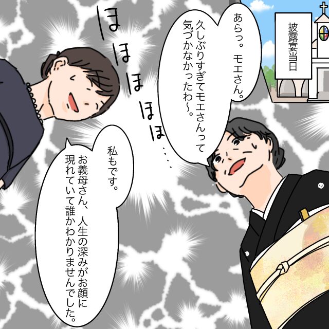 そしてキョウヘイくんの披露宴当日。「あらっモエさん。久しぶりすぎてモエさんって気づかなかったわ~」と数年ぶりに会っても一言目から嫌味全開の義母に、私も負けじと「私もです。お義母さん、人生の深みがお顔に現れていて誰かわかりませんでした」と笑顔で返しました。