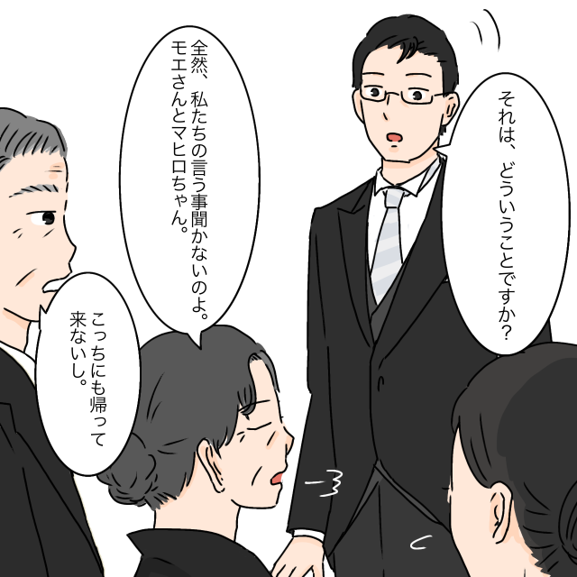 そこへ、「それは、どういうことですか?」とたずねられ、「全然、私たちの言う事聞かないのよ。モエさんとマヒロちゃん」「こっちにも帰って来ないし」とまたしても文句ばかり言う義父母でした。