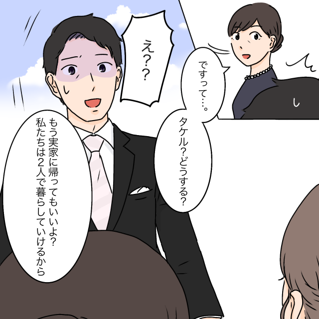 「ですって・・。タケル?どうする?」とたずねると、「え??」と動揺するタケルに、「もう実家に帰ってもいいよ?私たちは2人で暮らしていけるから」と言うと、