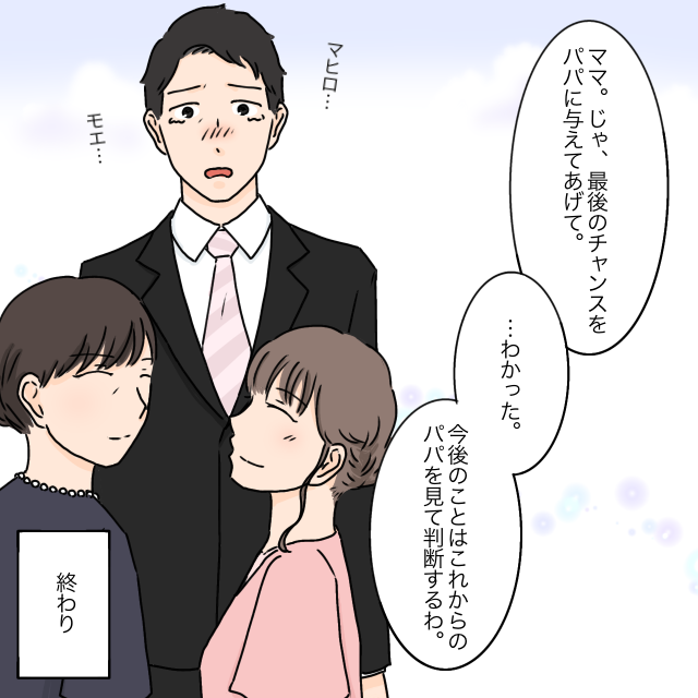 そして、「ママ。じゃ、最後のチャンスをパパに与えてあげて」マヒロにそう言われ、「・・わかった。今後のことはこれからのパパを見て判断するわ」と笑顔で答える私。それを聞いてタケルは「マヒロ・・モエ・・」と涙ぐんでいました。