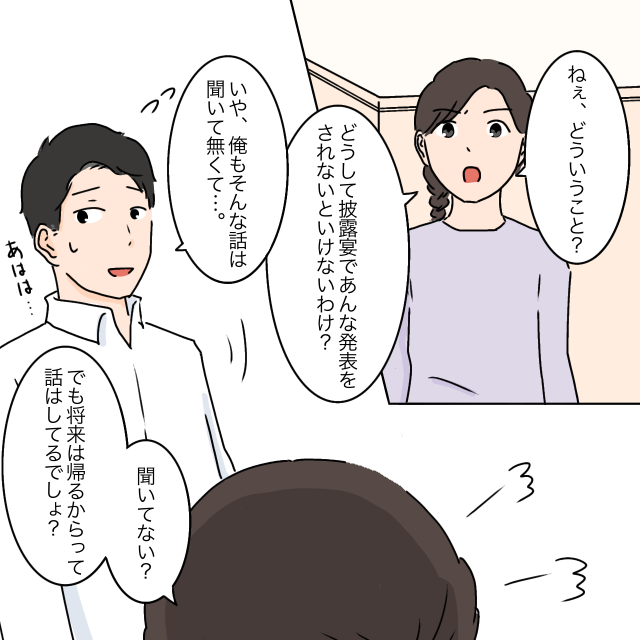 披露宴での義母の「モエさんは家の手伝いをしてもらう」という勝手な宣言に怒り心頭の私は披露宴の後、当然タケルに詰め寄りました。「どういうこと?どうして披露宴であんな発表をされないといけないわけ?」義母が話しているときに見たタケルの反応から、絶対知っていたはず。それなのにタケルは「いや、俺もそんな話は聞いてなくて。」とばつが悪そうに笑いました。タケルが「その辺は抜かりない」と笑っていたのも聞こえていた私は「でも将来は帰るからって話はしてるでしょ?」と問い詰めました。