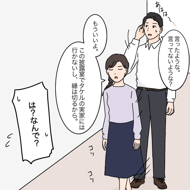 「言ったような。言ってないような?」ととぼけて笑うタケルにがっかりしました。「もういいよ。この披露宴でタケルの実家には行かないし、縁は切るから。」と私も宣言しました。そのとたん「は?なんで?」と焦り始めるタケル。