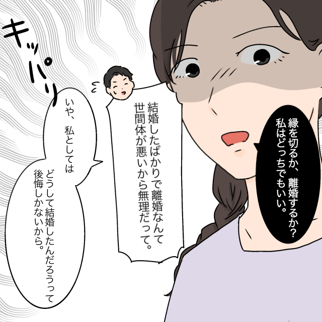 「縁を切るか、離婚するか?私はどっちでもいい。」と真顔で言うと、「結婚したばかりで離婚なんて世間体が悪いから無理だって。」と周りの目ばかりするタケルに「いや、私としてはどうして結婚したんだろうって後悔しかないから。」とキッパリはねのけました。