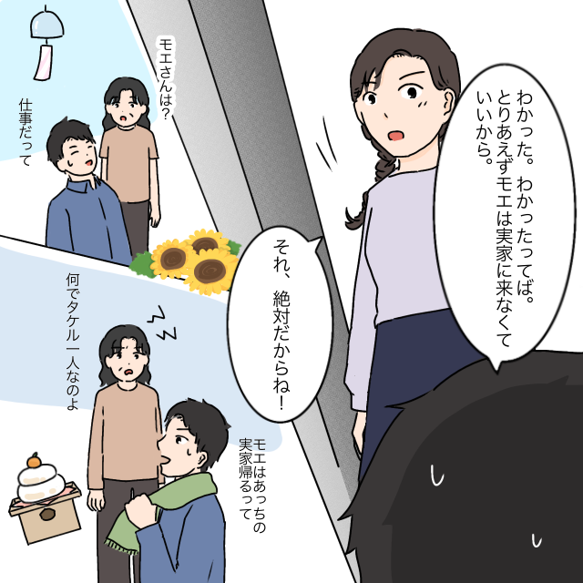 タケルは「分かった。分かったってば。とりあえずモエは実家に来なくていいから」とタケルは渋々私が実家と距離を置くことは了承しました。「それ、絶対だからね!」と念を押した私は、盆も正月も一切義実家へ行きませんでした。その都度文句を言う義母にタケルは「仕事だって」「あっちの実家帰るって」とごまかし続けていたようです。