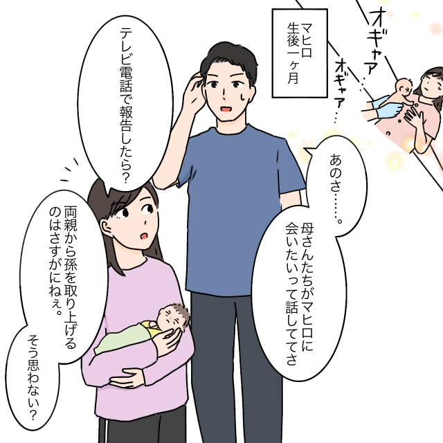 その後私は女の子を出産しました。マヒロが1カ月の頃、「母さんたちがマヒロに会いたいって話しててさ」と言いにくそうにタケルは切り出しました。「テレビ電話で報告したら?」と私は顔色一つ変えずにサラリ。すると「両親から孫を取り上げるのはさすがにねぇ。そう思わない?」とタケルは私が意地悪みたいな言い方をしてきました。