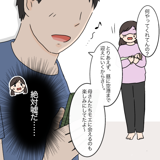 「何やってくれてんの?」と固まる私ですが、「とりあえず、昼に空港まで迎えに行くからさ~。母さんたち、モエに会えるのも楽しみにしてたよ~。」と、ウキウキしています。絶対嘘だ。結婚式以来、義実家には寄り付かなかったし連絡も一切していない私のことは、悪口は言っても会うのを楽しみなんて言うはずがありません。
