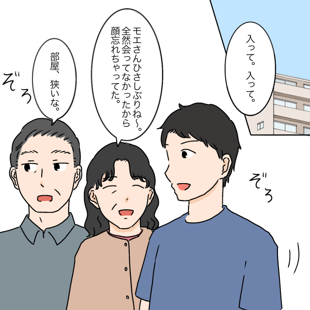 「言うと嫌がるの分かってるから」という理由で私には何の相談もなく、勝手に義両親を家に呼び、反対してもどうしようもない状況を作ったタケル。しばらくすると空港まで迎えに行ったタケルが帰ってきました。「部屋、狭いな」と見まわしながら入ってくる義父と、「モエさん久しぶりね~。全然会ってなかったから忘れちゃってた。」と嫌味全開の義母。