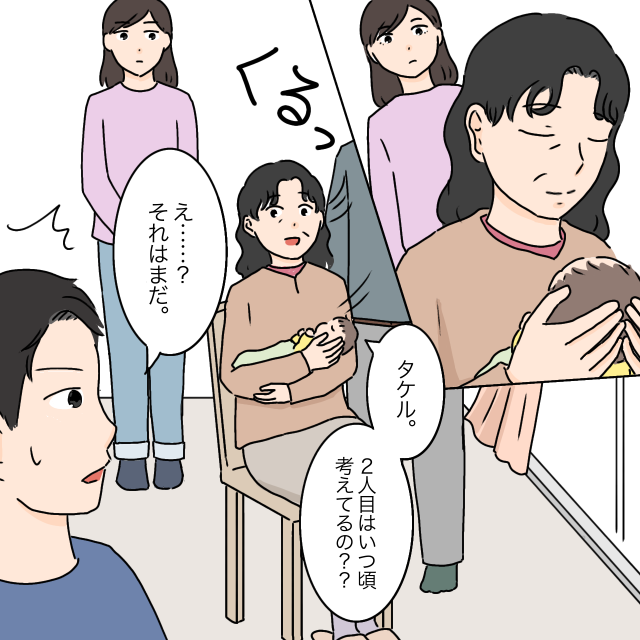 マヒロを抱っこした義母に、さっそく「2人目はいつ頃考えてるの?」と聞かれたタケルは「え?それはまだ」と落ち着かない様子です。