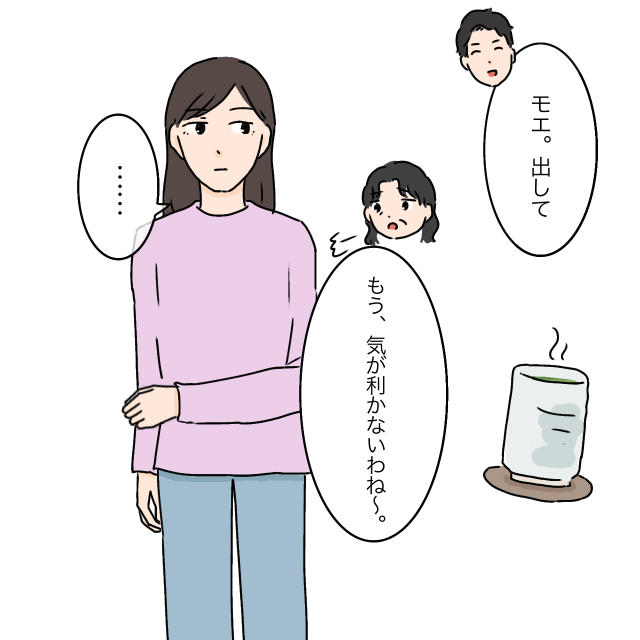 そして「モエ。出して。」と・・・いつもなら飲みたい人が飲みたいタイミングで淹れてるのに。「もう、気が利かないわね~。」と義母が呆れたようにため息をついて言いました。それでも私は無表情のまま。無言で動きませんでした。