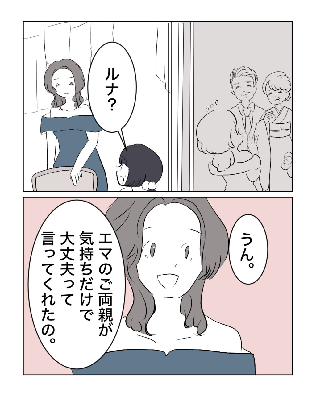 そしてエマさんのご両親に「ご祝儀のお金を間違えてしまって・・」と謝った後、自分の席に戻って来たルナさんに、「ルナ?」リオさんが声をかけると、「うん。エマのご両親が気持ちだけで大丈夫って言ってくれたの」とルナさんは平然と答えました。