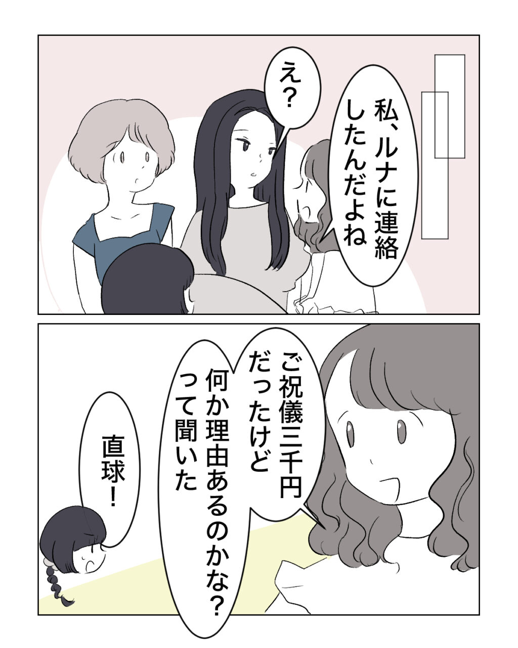 エマさんの結婚式でご祝儀を3千円しか入れず、「間違えちゃった?」と平然と答えるルナさんは、現金もないし、とエマさんのご両親の所へ。ご祝儀の金額を間違えたと話し、「気持ちだけで大丈夫って言ってくれた」と言われ、何も言えなくなるリオさん。その後、「ご祝儀3千円だったけど、何か理由あるのかな?」と直球で質問したエマさんに、「どうしたの?そんなこという子じゃないよね?もしかしてお金に困ってる?」と返信したルナさん、本当、どんな神経をしているのでしょうか!?