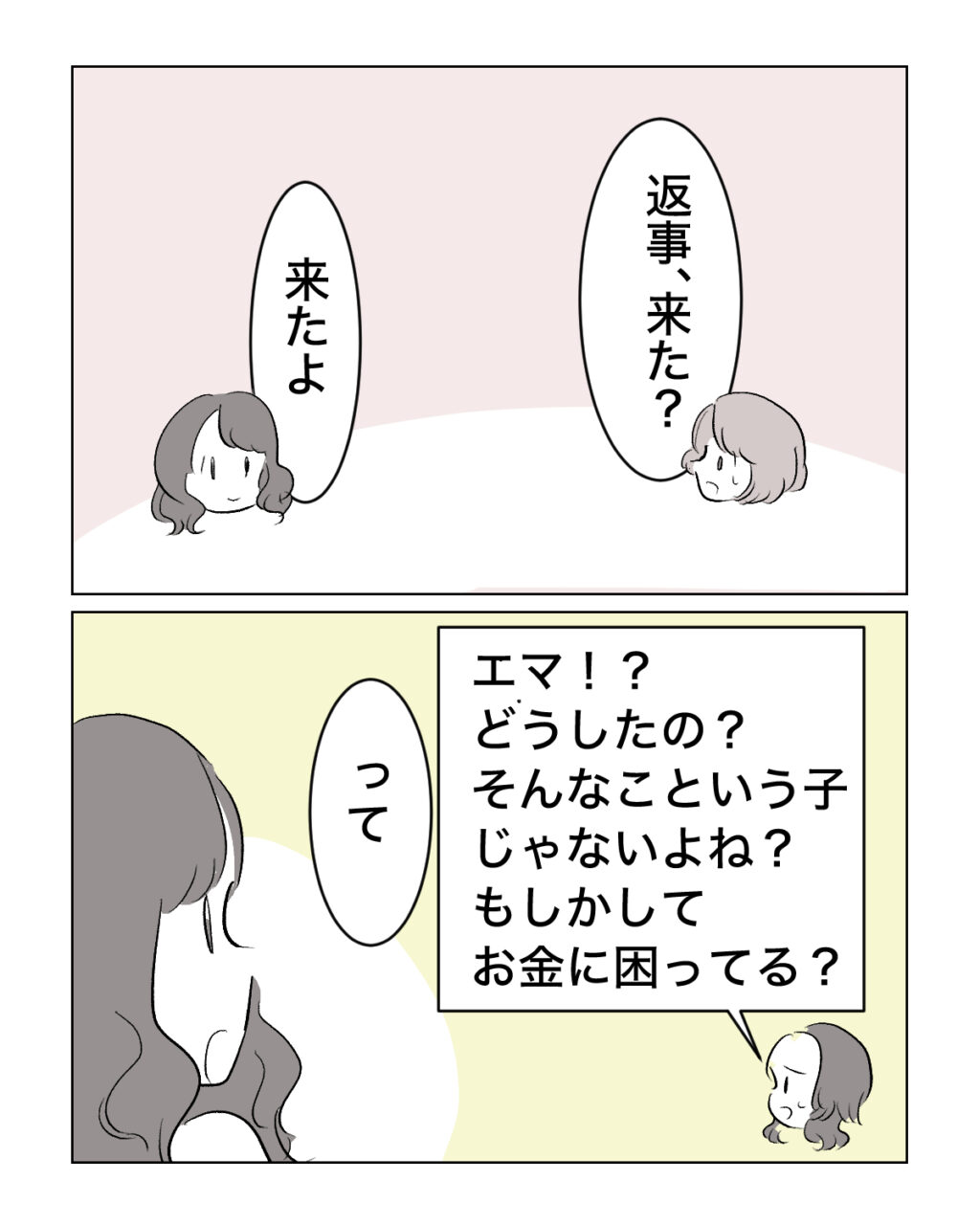 ルナさんからは、「エマ!?どうしたの?そんなこという子じゃないよね?もしかしてお金に困ってる?」と返事が来たようでした。