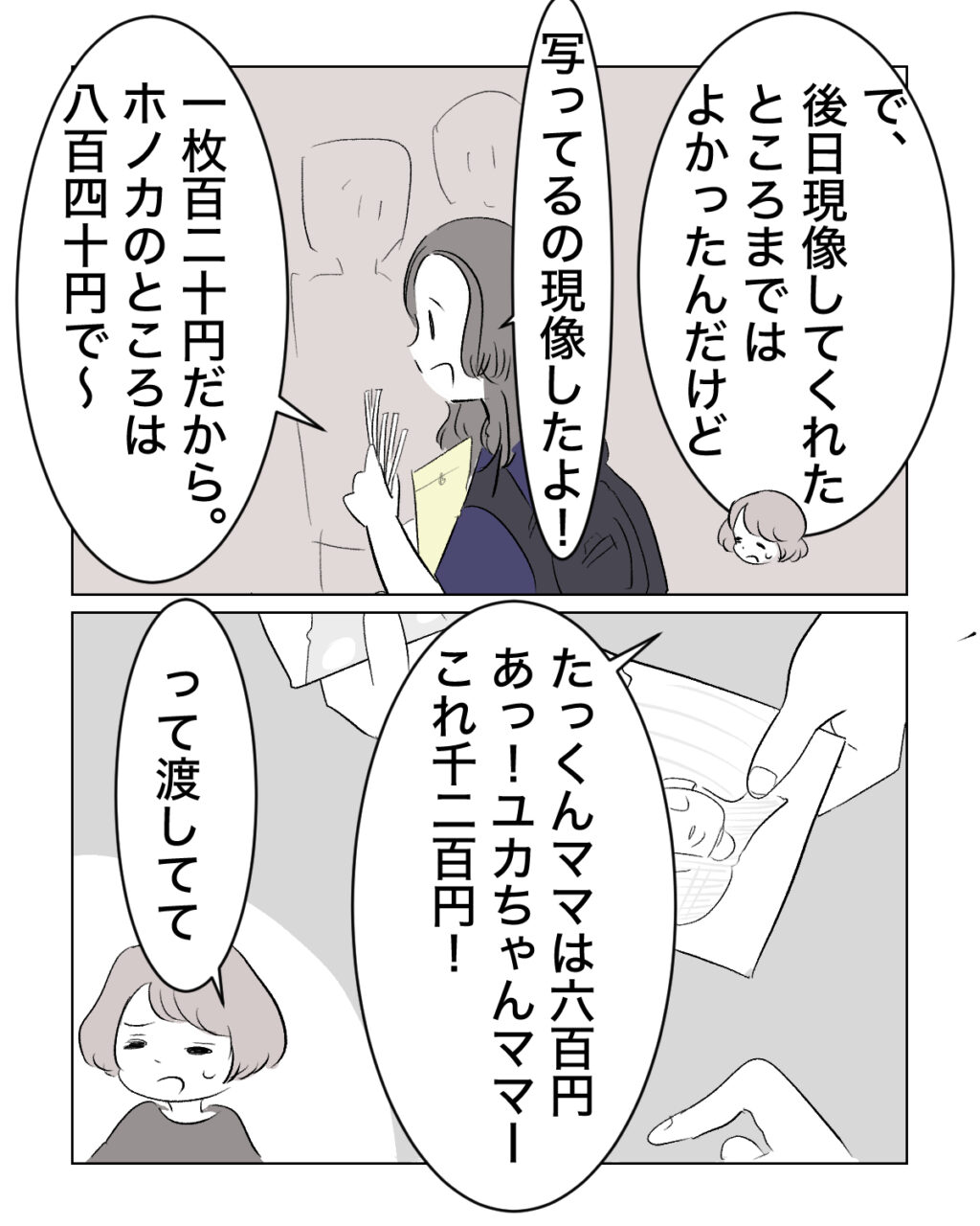 「写ってるの現像したよ!1枚20円だから。ホノカのところは840円で~、たっくんママは600円、あっ!ユカちゃんママー、これ1,200円!」