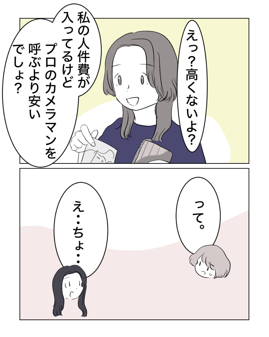 「『えっ?高くないよ?私の人件費が入ってるけど、プロのカメラマンを呼ぶより安いでしょ?』って」ホノカさんの言葉に、「え・・ちょ・・」と言ったアオイさんが驚くと、