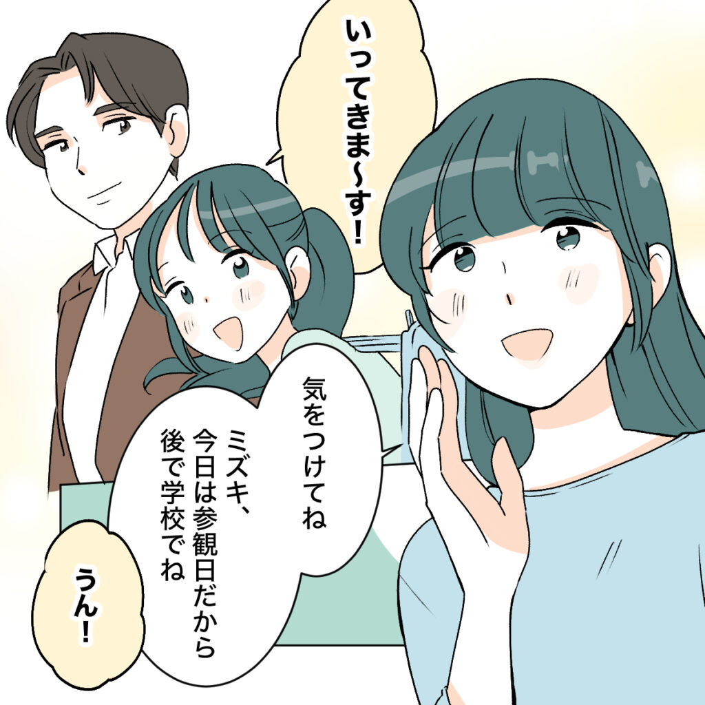 いつもの朝。夫ワタルの出勤と、娘ミズキの登校を見送る私はシズク。高校の同級生だったワタルとは社会人になってからの同窓会で再会して付き合い始め、結婚しました。