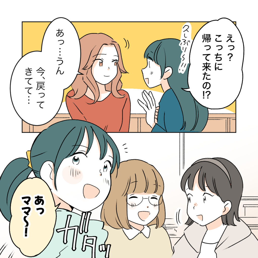 「えっ?こっちに帰って来たの!?」と聞くと、「今、戻ってきてて・・・」となんとなく言葉をにごしたカエデ。話している私たちを、お友達と話していたミズキが見つけて「ママ~!」と走ってきました。