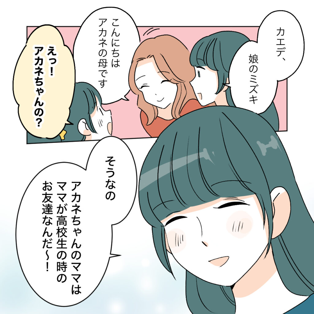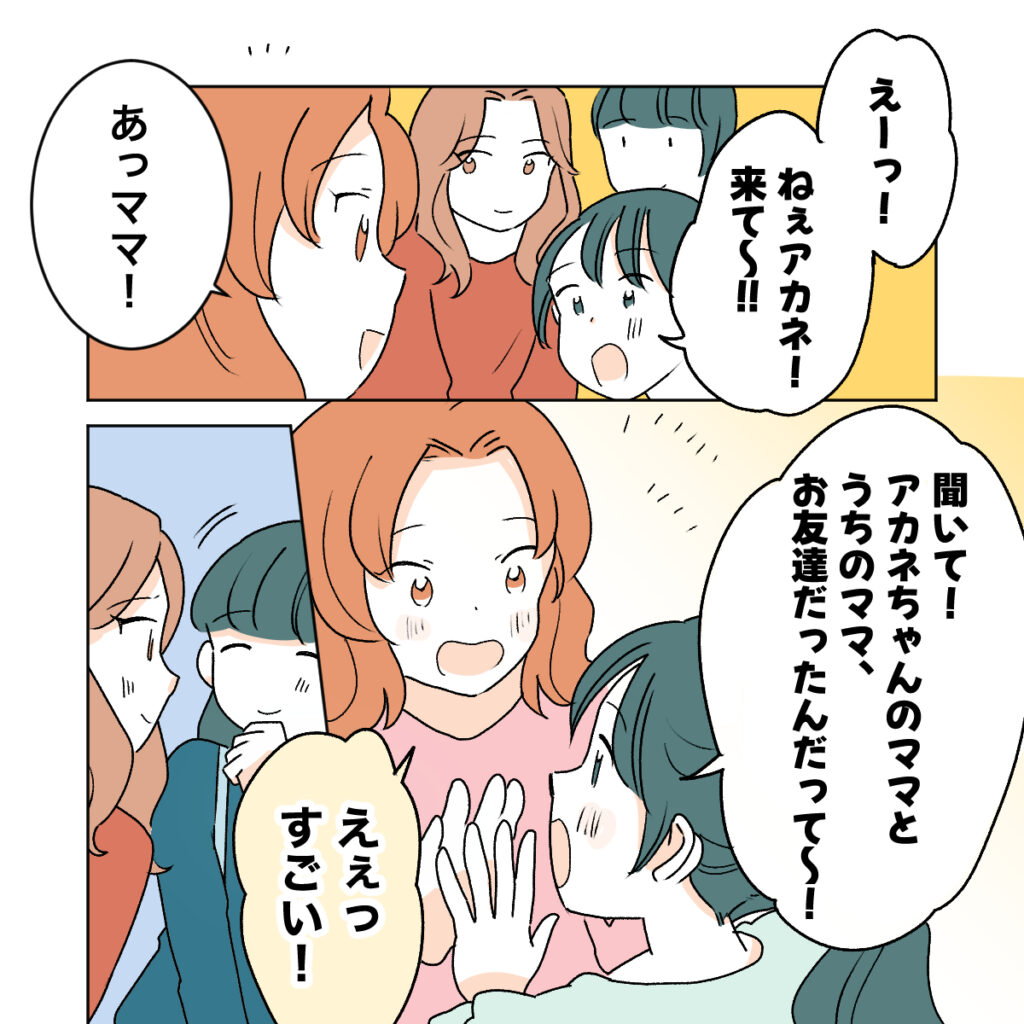 「ねぇアカネ!来て~!!アカネちゃんのママとうちのママ、お友達だったんだって~!」ミズキがそう言うと、アカネちゃんも「えぇっすごい!」と嬉しそうに2人ではしゃぎだしました。私とカエデは娘たちの様子に思わず顔を見合わせて笑顔になりました。