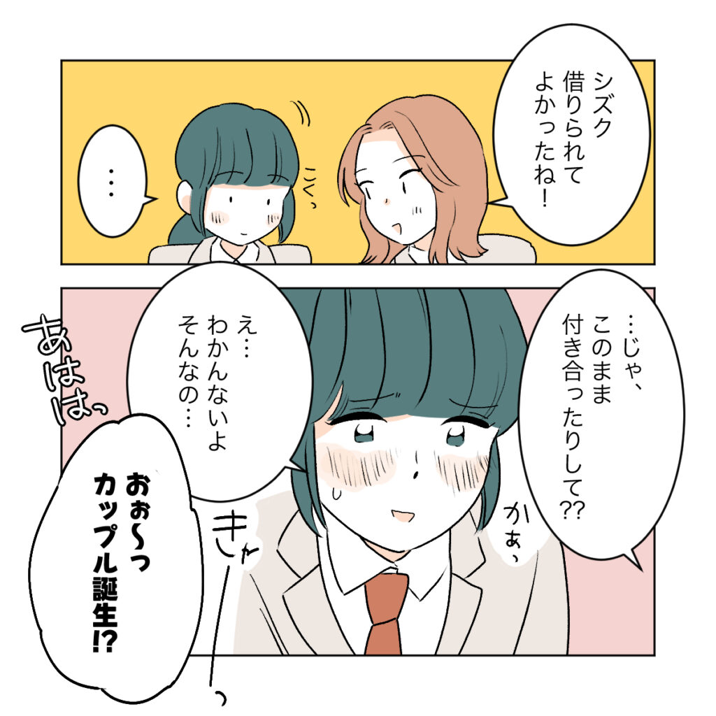 カエデは「シズク、借りられて良かったね!」とシズクの耳元で言いました。「じゃ、このまま付き合ったりして?」「カップル誕生!?」と口々にみんなに言われて「え、わかんないよそんなの・・・」とシズクは耳まで真っ赤になって答えました。