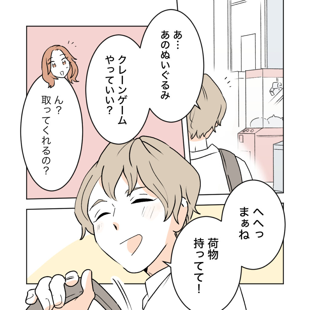 帰り道、クレーンゲームに気づいたショウマは、嬉しそうに「やっていい?」とカエデに荷物を預けました。