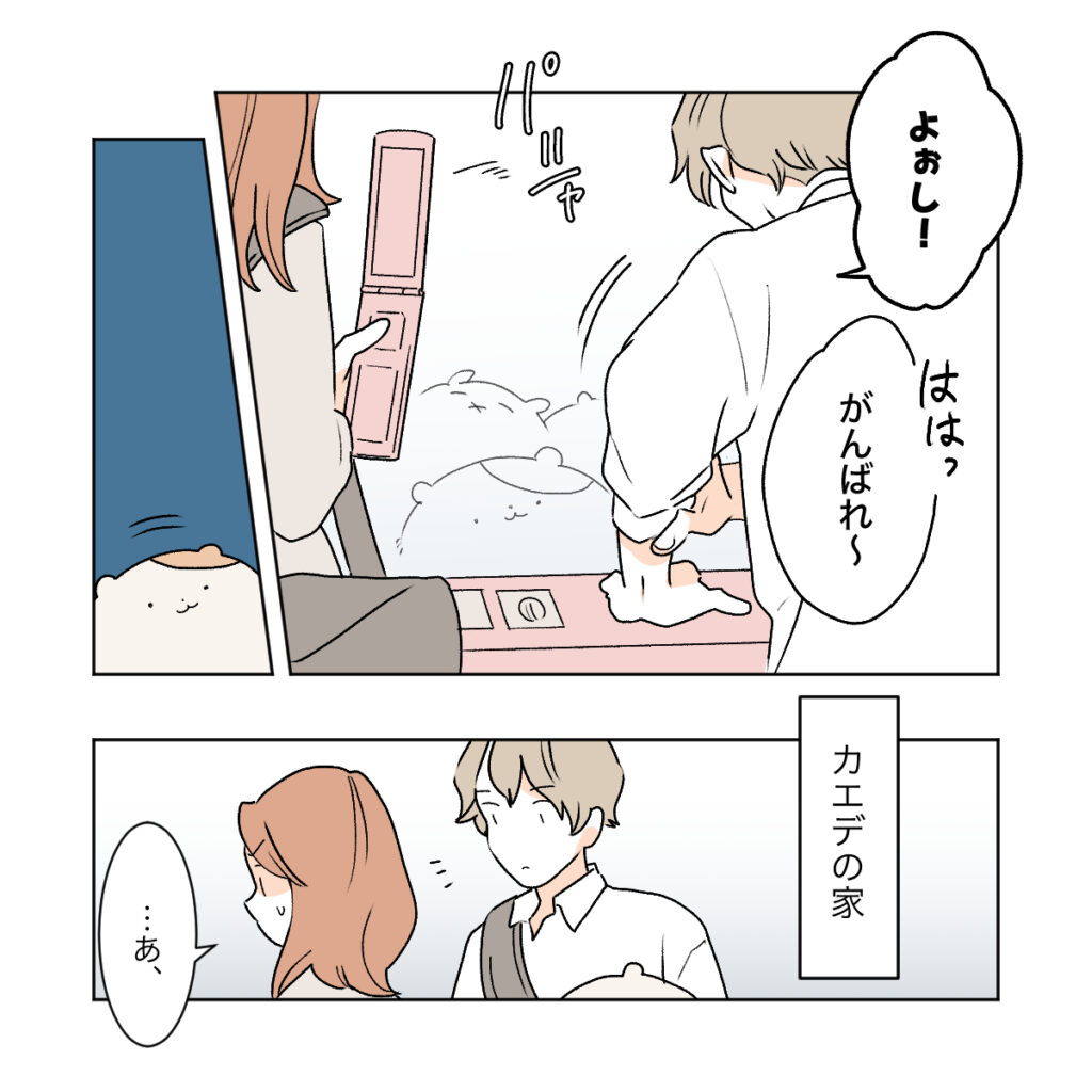 大きなぬいぐるみゲット目指してクレーンゲームに挑むショウマの姿を笑いながら写真に収めるカエデ。ショウマは目当てのぬいぐるみをゲットして、2人はカエデの家に着きました。