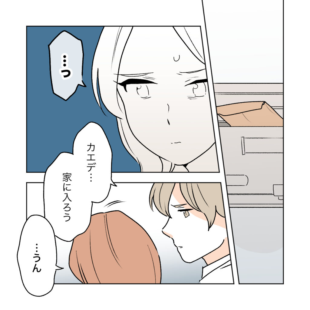 ポストに1通の手紙が入っているのを見つけたカエデの顔が曇りました。なんの手紙か分かっているショウマは「カエデ、家に入ろう」と優しく言いました。